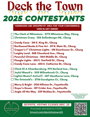 Visit the following homes and businesses in the Chambersburg area and vote for your favorite display of Christmas lights! Winners announced on Dec. 23. Proceeds will go to the Cumberland Valley Animal Shelter!