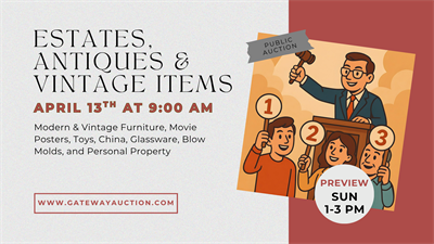 Join us in person or online for an exciting day of bidding on treasures! Whether you're a collector or just love the thrill of the hunt, this auction is packed with estate items, vintage finds, and unique antiques. Featuring Modern & Vintage Furniture, Movie Posters, Toys, China, Glassware, Blow Molds, and Personal Property and much more! Come meet fellow enthusiasts, discover hidden gems, and maybe walk away with that special piece you've been searching for. Don't miss out on the fun and fantastic stuff waiting for you!