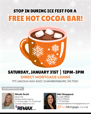 Stop by to see Nicole Scott, REALTOR and Niki Sheppard, Loan Originator and grab a complimentary cup of Hot Cocoa on you way down to Ice Fest! We are conveniently located one block away at the Direct Mortgage Loans office! We hope to see you there!