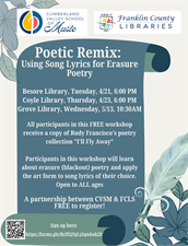 Participants in this workshop will learn about erasure (blackout) poetry and apply the art form to song lyrics of their choice.