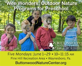 Outdoor nature series for kids ages 2.5 years through 5. Pre-registration for full series required. Children must be accompanied by a parent. Taught by Buttonwood educators, age-appropriate program activities make learning fun, and include exploring the outdoors, hikes, nature stories, rhymes, finger plays, nature games, and puppets. This summer’s Wee Wonders is celebrating the season…dancing, leafing, splashing, planting and more—into summer. Series Fee: $40 Buttonwood Nature Center member, $45 general public, per child. Register online before May 25: buttonwoodnaturecenter.org. For more information, call 717-762-0373 or email to info@buttonwoodnaturecenter.org.